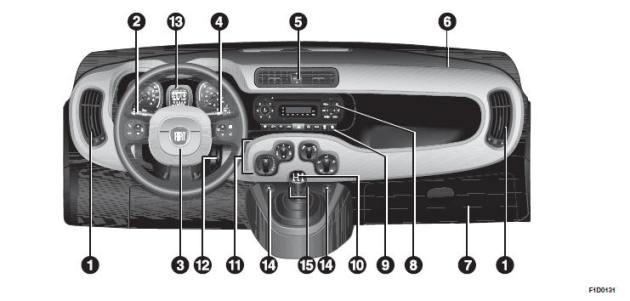 Fiat Panda: Plancia portastrumentiLa presenza e la posizione dei comandi, degli strumenti e segnalatori possono variare in funzione delle versioni.